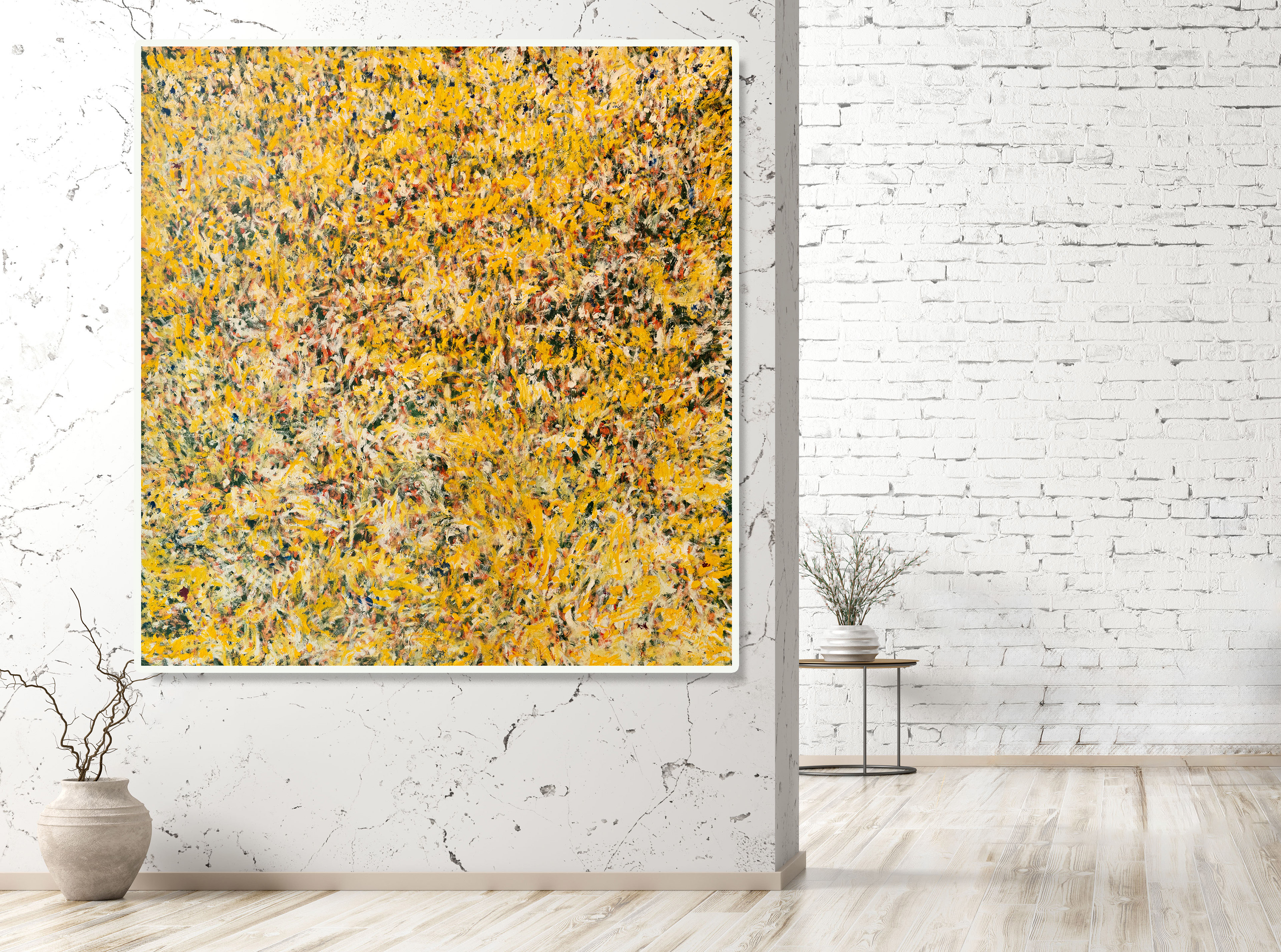 "Champ de Lumière" est une toile de grande dimension réalisée dans un style impressionniste, où la couleur jaune domine, évoquant la lumière et la chaleur. Le vert et le rouge sont utilisés en sous-couche pour ajouter de la profondeur et des contrastes subtils. L'absence d'horizon donne une sensation d'infini et de liberté, renforçant l'idée d'un champ baigné de lumière sans limites. Cette peinture a été réalisée entièrement à la main, utilisant les bouts des doigts pour créer des textures et des mouvements uniques.