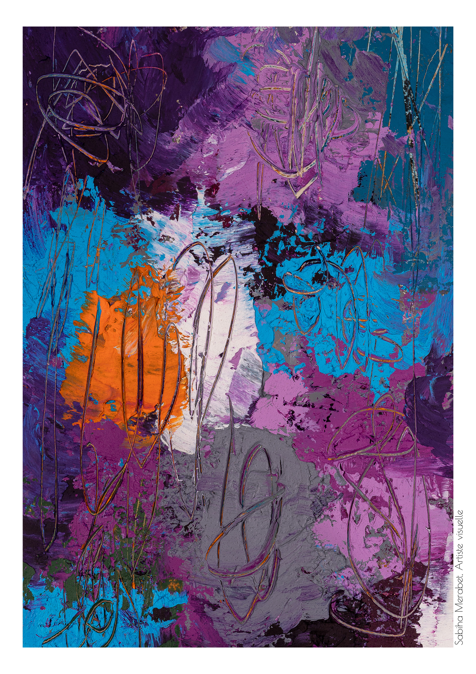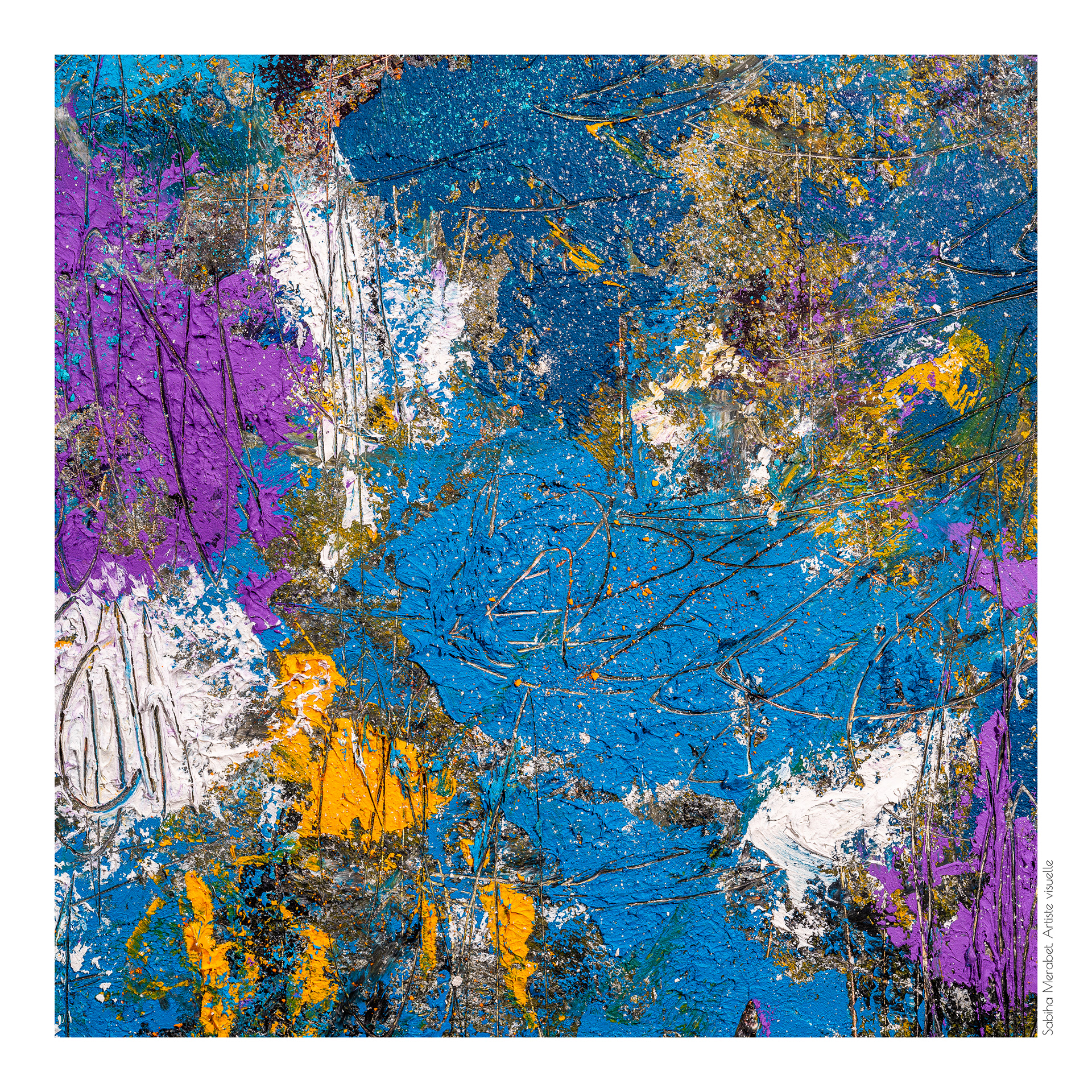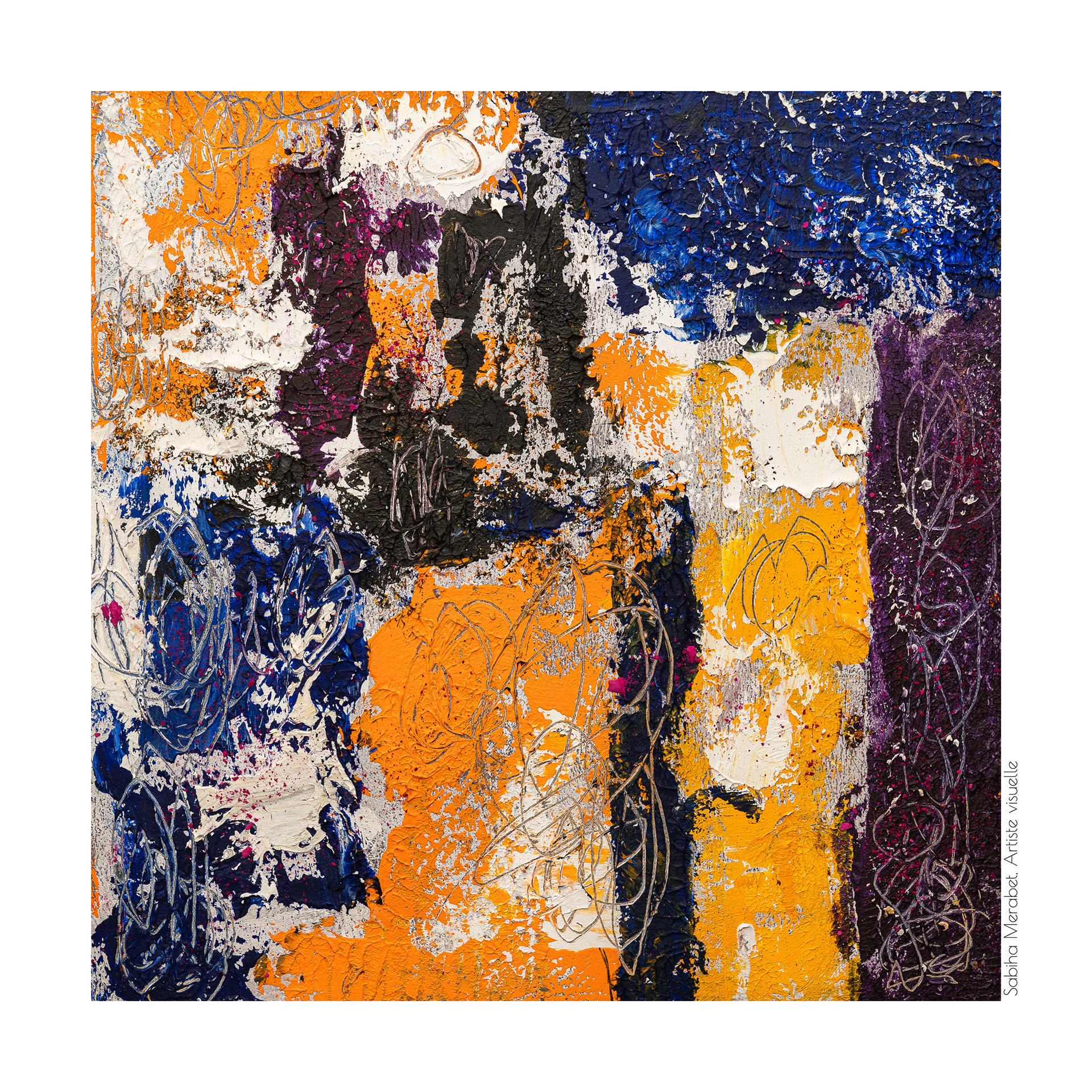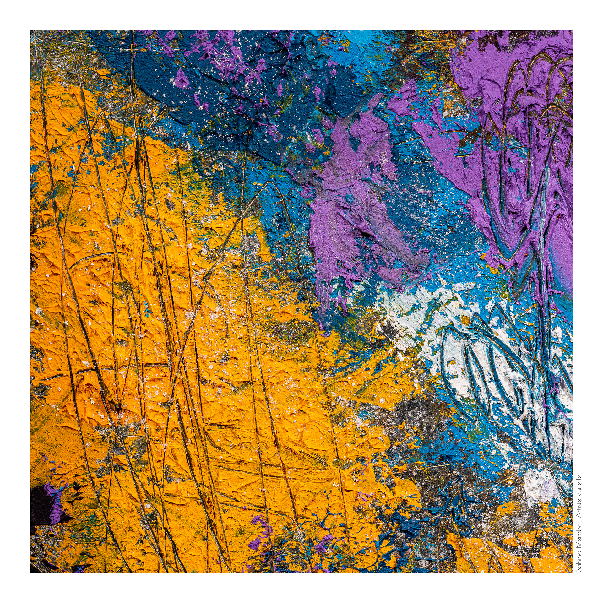 Mon travail explore l’abstraction pure à travers des peintures réalisées sur du papier marouflé sur bois, élevant chaque œuvre au rang d’objet unique. Ces créations sont marquées par des couleurs vives et dynamiques, un jeu de traces et de gravures qui se superposent pour capturer l’énergie brute et la vitalité qui m’habitent. On ressent dans chaque pièce ma soif insatiable de transmettre une énergie authentique, un souffle de vie qui traverse et anime l’espace pictural. L'intention derrière Côte à Côte est d'inviter le spectateur à explorer les différences et les connexions subtiles entre les deux pièces, tout en laissant une liberté d’interprétation. Cette démarche permet de rappeler qu'une œuvre, même terminée, continue de vivre et d'évoluer au gré de ceux qui la contemplent et de l’artiste qui y revient. C’est une exploration du passage du temps et de la manière dont chaque intervention peut redonner vie, changer la perception et apporter une profondeur nouvelle.