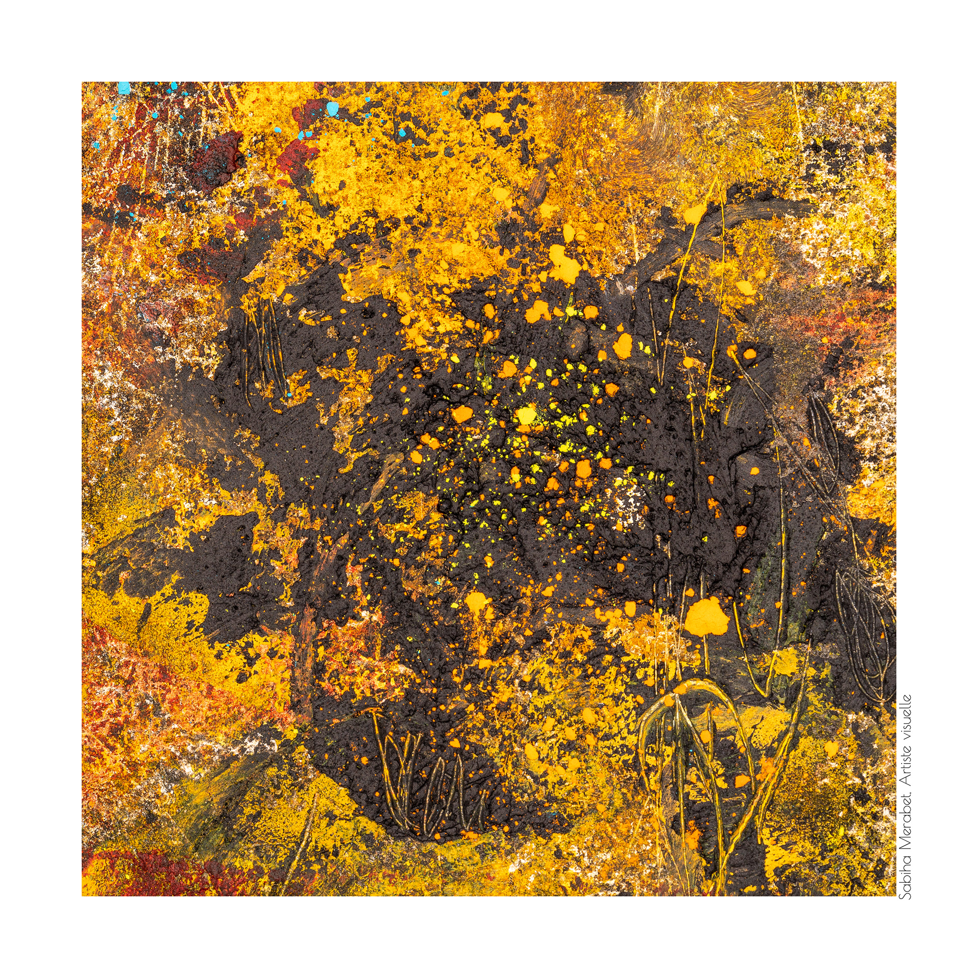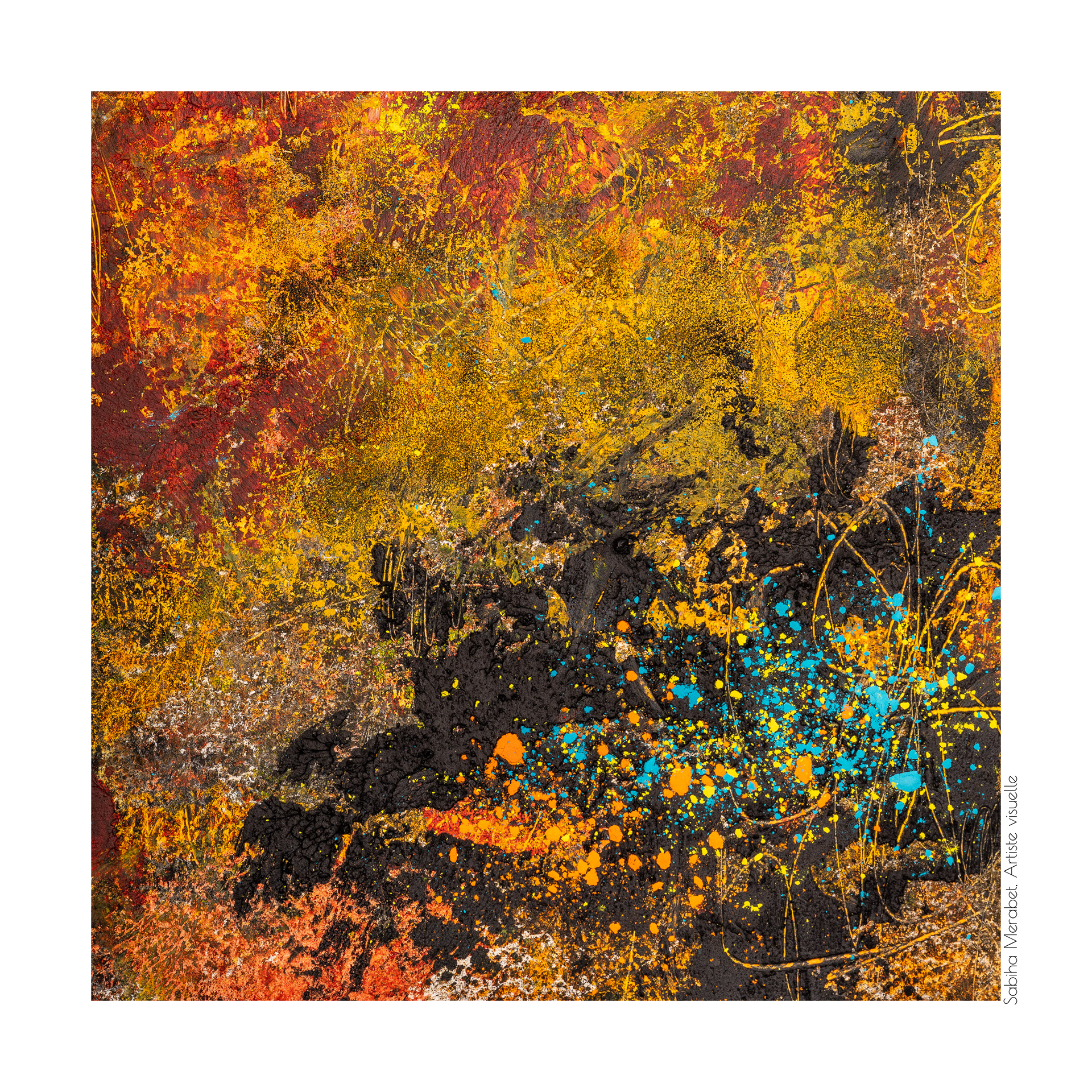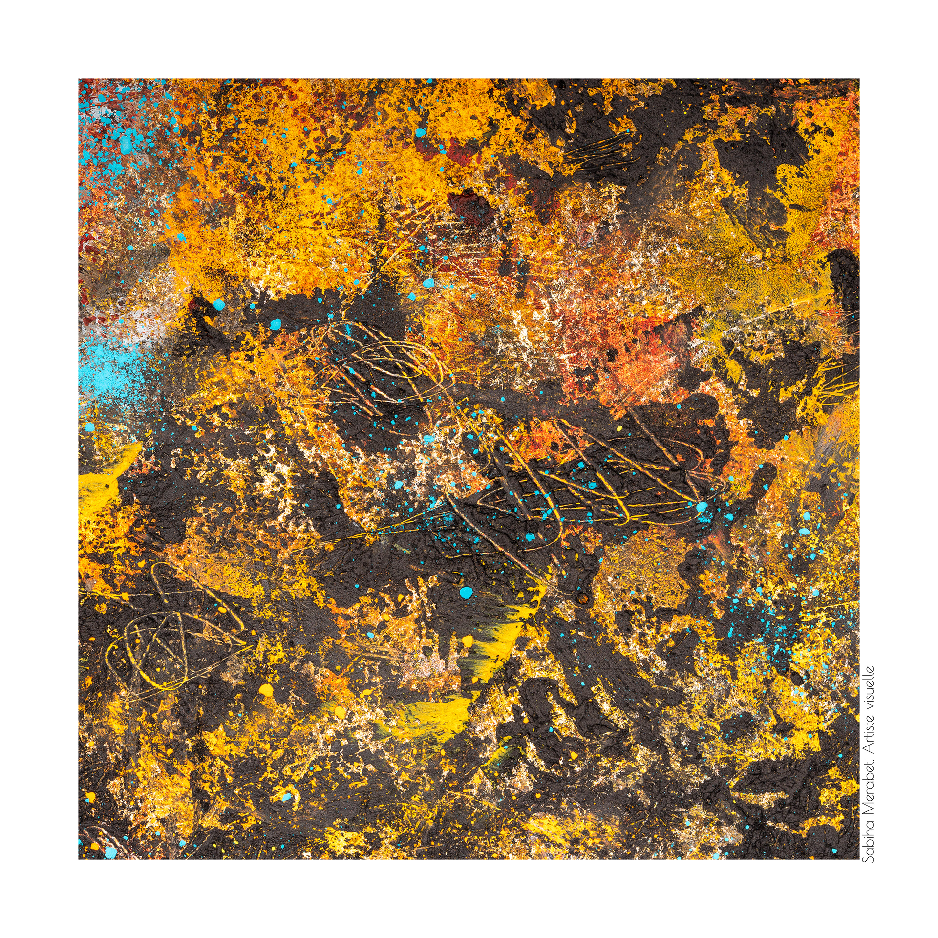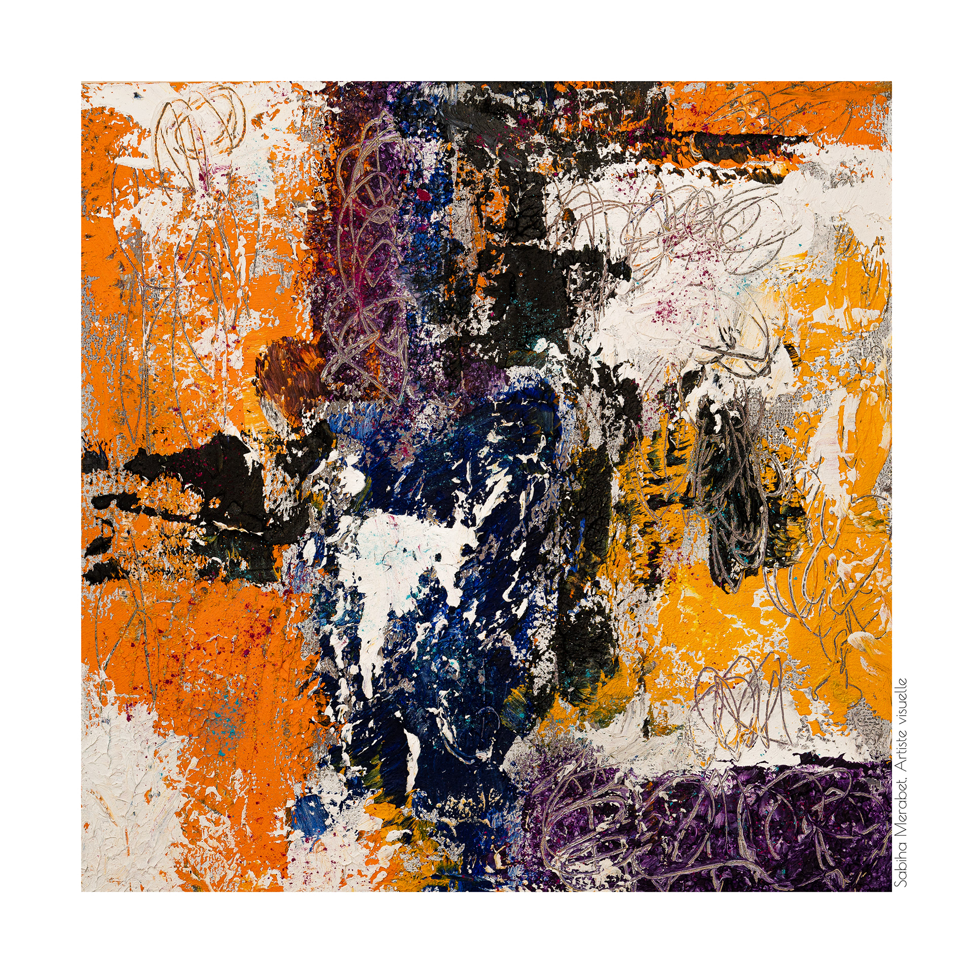 Mon travail explore l’abstraction pure à travers des peintures réalisées sur du papier marouflé sur bois, élevant chaque œuvre au rang d’objet unique. Ces créations sont marquées par des couleurs vives et dynamiques, un jeu de traces et de gravures qui se superposent pour capturer l’énergie brute et la vitalité qui m’habitent. On ressent dans chaque pièce ma soif insatiable de transmettre une énergie authentique, un souffle de vie qui traverse et anime l’espace pictural. L'intention derrière Côte à Côte est d'inviter le spectateur à explorer les différences et les connexions subtiles entre les deux pièces, tout en laissant une liberté d’interprétation. Cette démarche permet de rappeler qu'une œuvre, même terminée, continue de vivre et d'évoluer au gré de ceux qui la contemplent et de l’artiste qui y revient. C’est une exploration du passage du temps et de la manière dont chaque intervention peut redonner vie, changer la perception et apporter une profondeur nouvelle.