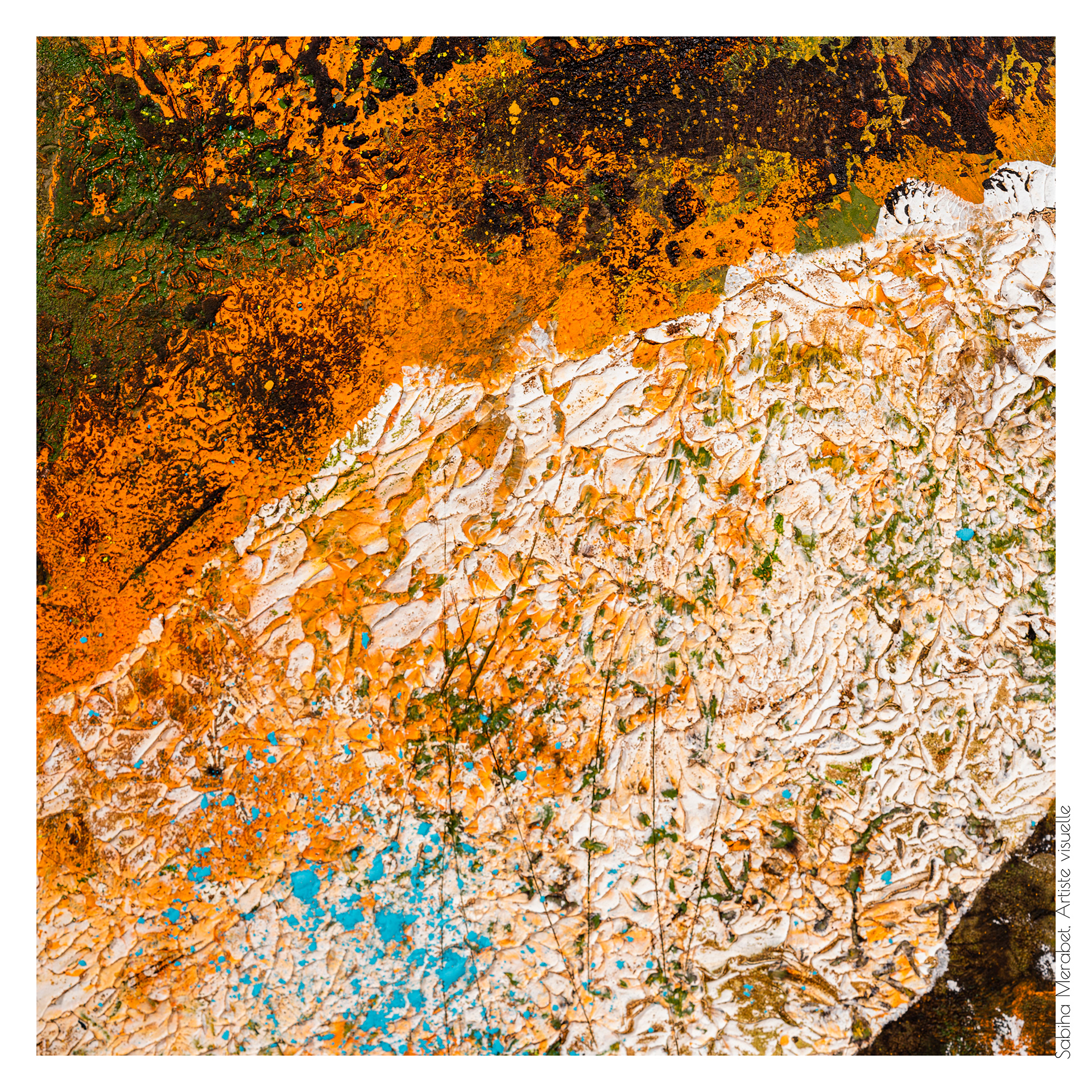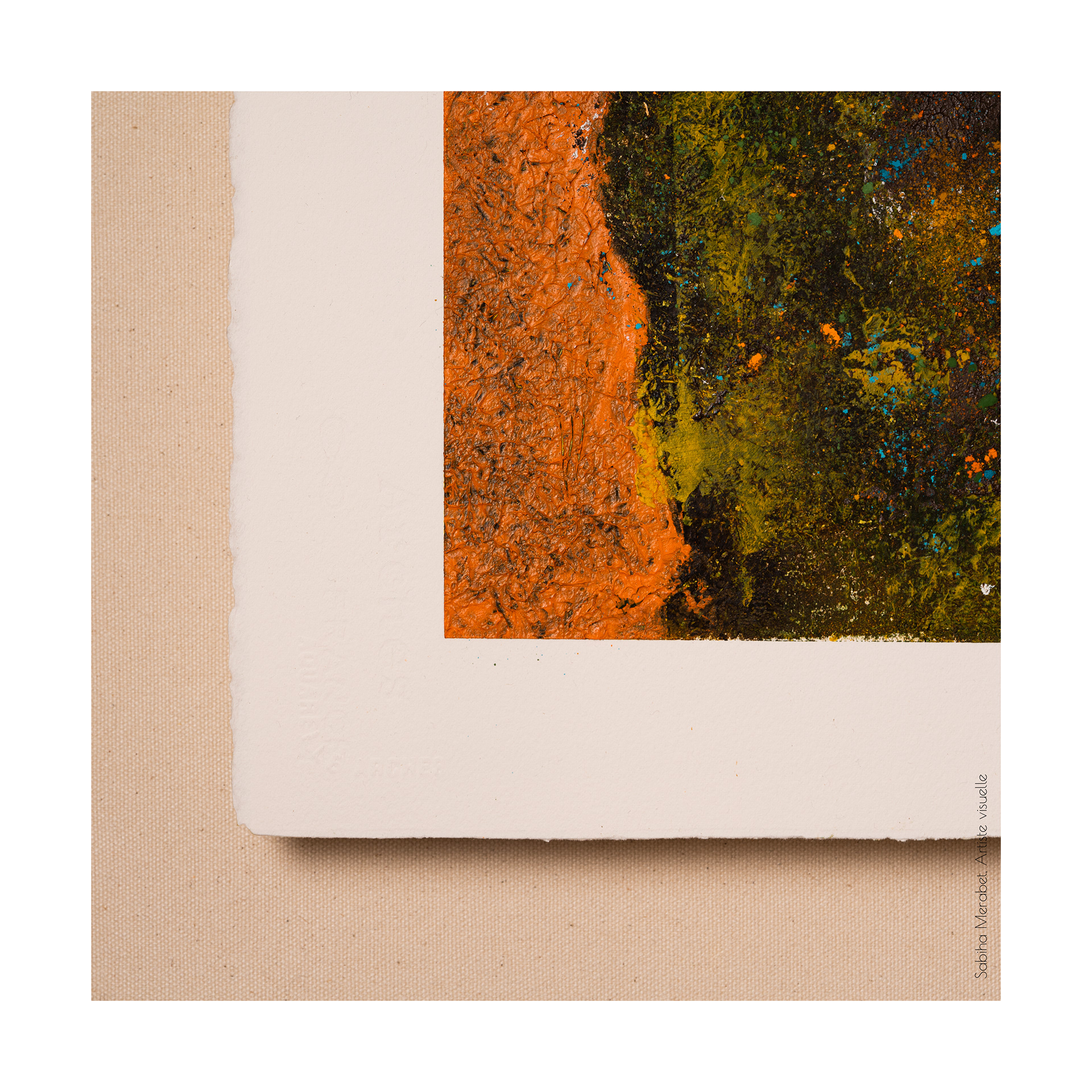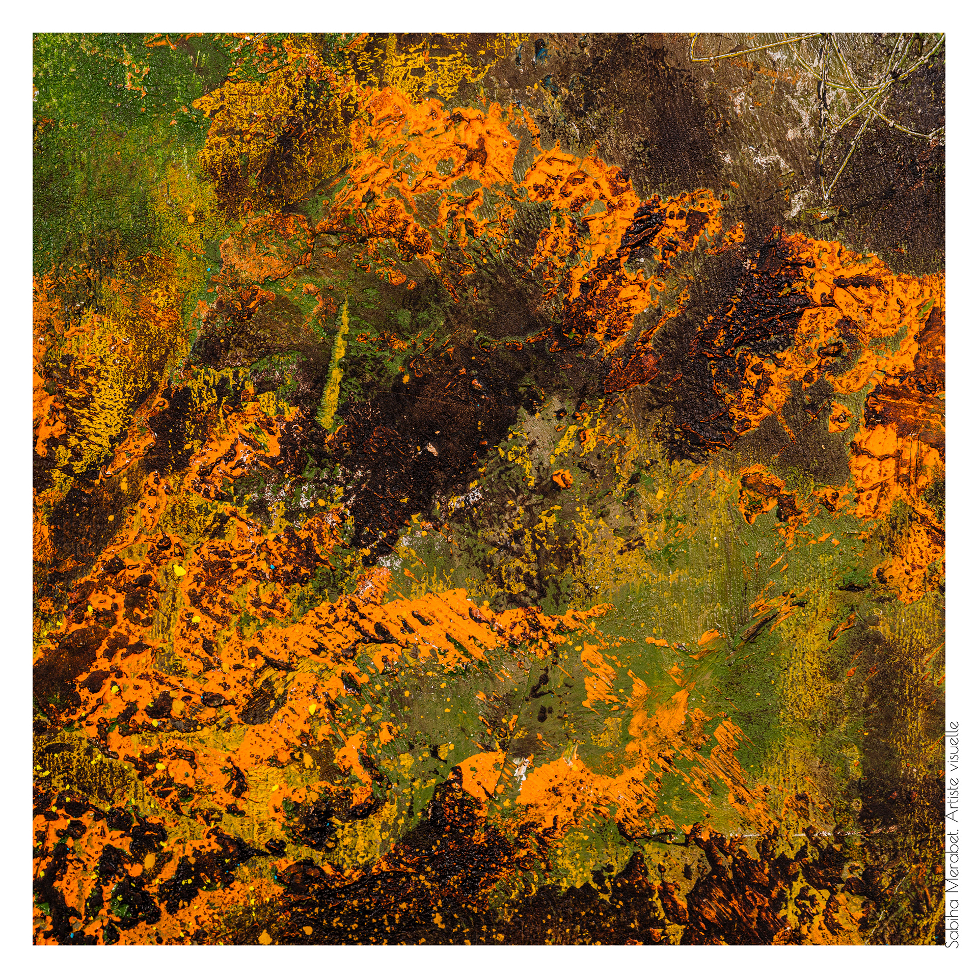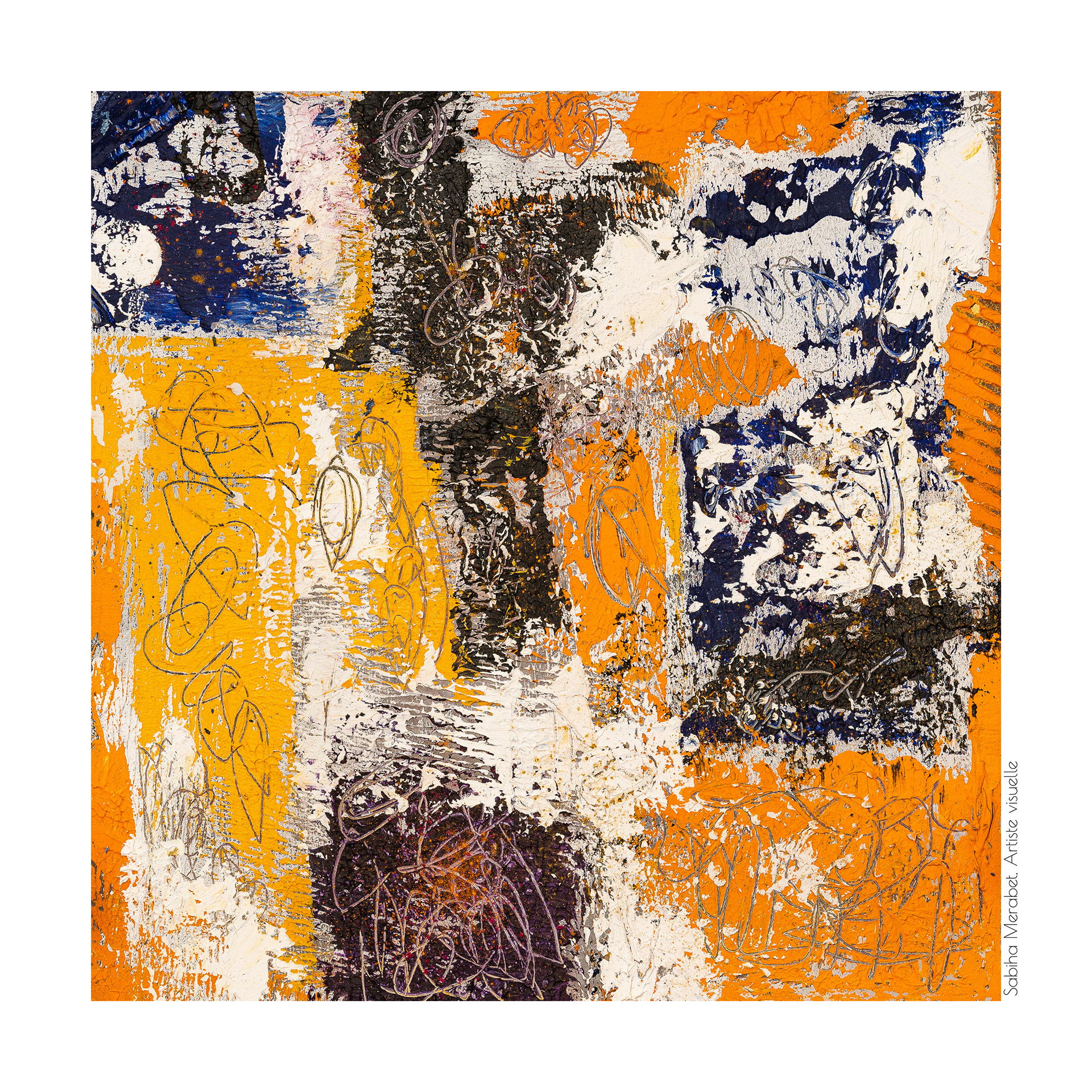 Mon travail explore l’abstraction pure à travers des peintures réalisées sur du papier marouflé sur bois, élevant chaque œuvre au rang d’objet unique. Ces créations sont marquées par des couleurs vives et dynamiques, un jeu de traces et de gravures qui se superposent pour capturer l’énergie brute et la vitalité qui m’habitent. On ressent dans chaque pièce ma soif insatiable de transmettre une énergie authentique, un souffle de vie qui traverse et anime l’espace pictural. L'intention derrière Côte à Côte est d'inviter le spectateur à explorer les différences et les connexions subtiles entre les deux pièces, tout en laissant une liberté d’interprétation. Cette démarche permet de rappeler qu'une œuvre, même terminée, continue de vivre et d'évoluer au gré de ceux qui la contemplent et de l’artiste qui y revient. C’est une exploration du passage du temps et de la manière dont chaque intervention peut redonner vie, changer la perception et apporter une profondeur nouvelle.