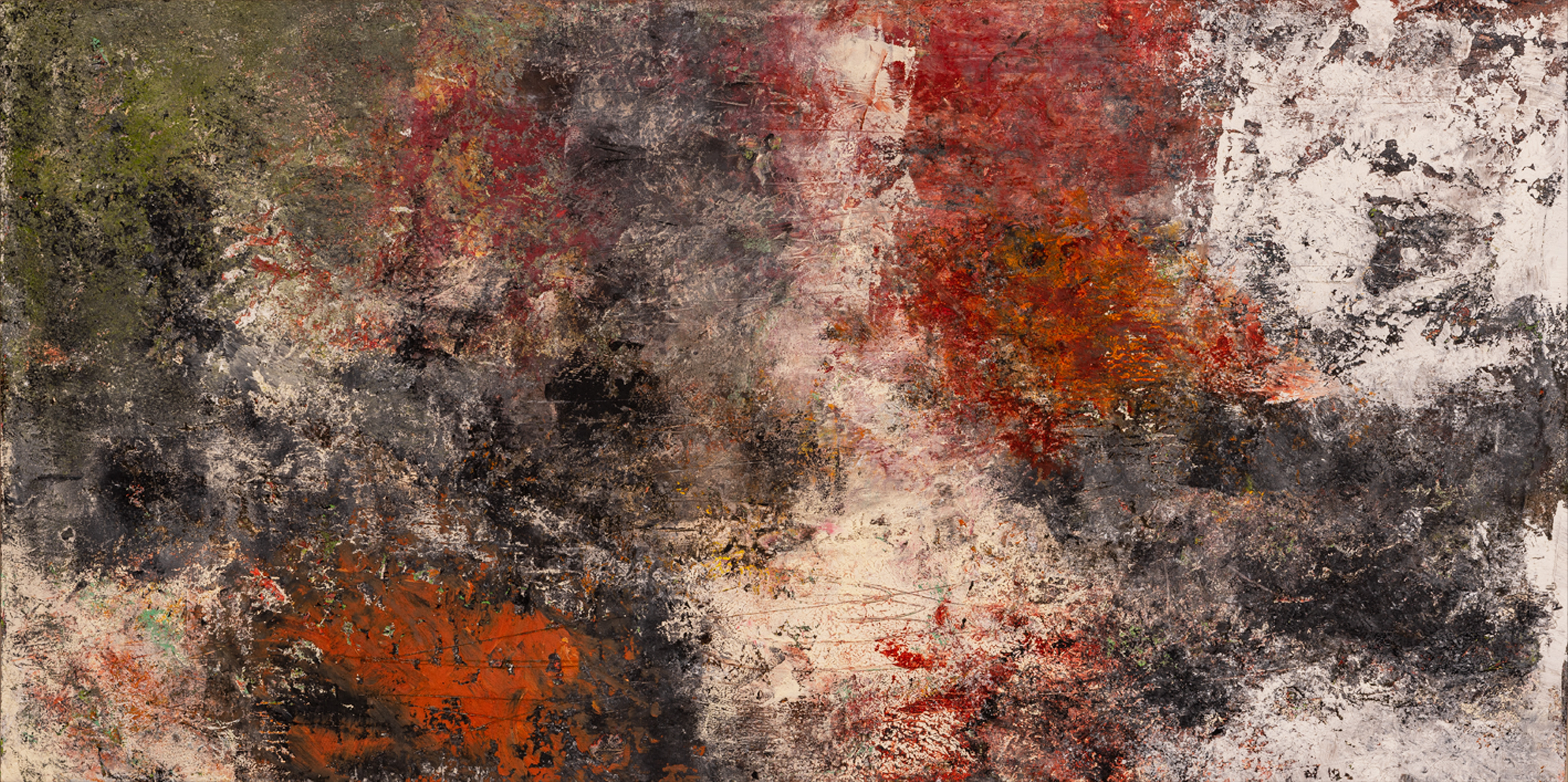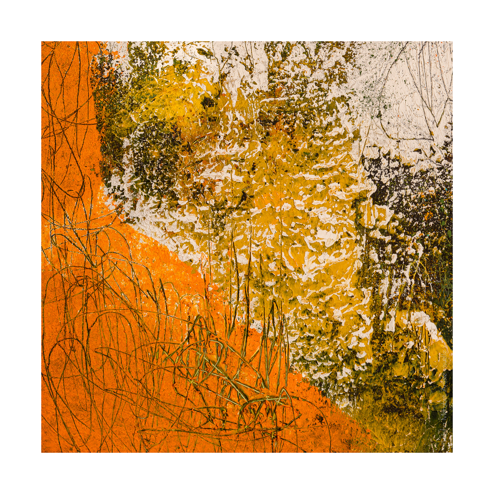 Voici ma dernière réalisation sur papier Arches en format 22 x 30 pouces peinture à l'huile et cire froide, poudre de marbre, fusain broyé à la main. Elle s'intègre dans la série Territoire avec des couleurs automnales et aux couleurs flamboyantes, on arrive même à sentir le feuillage, la terre et les arbres.