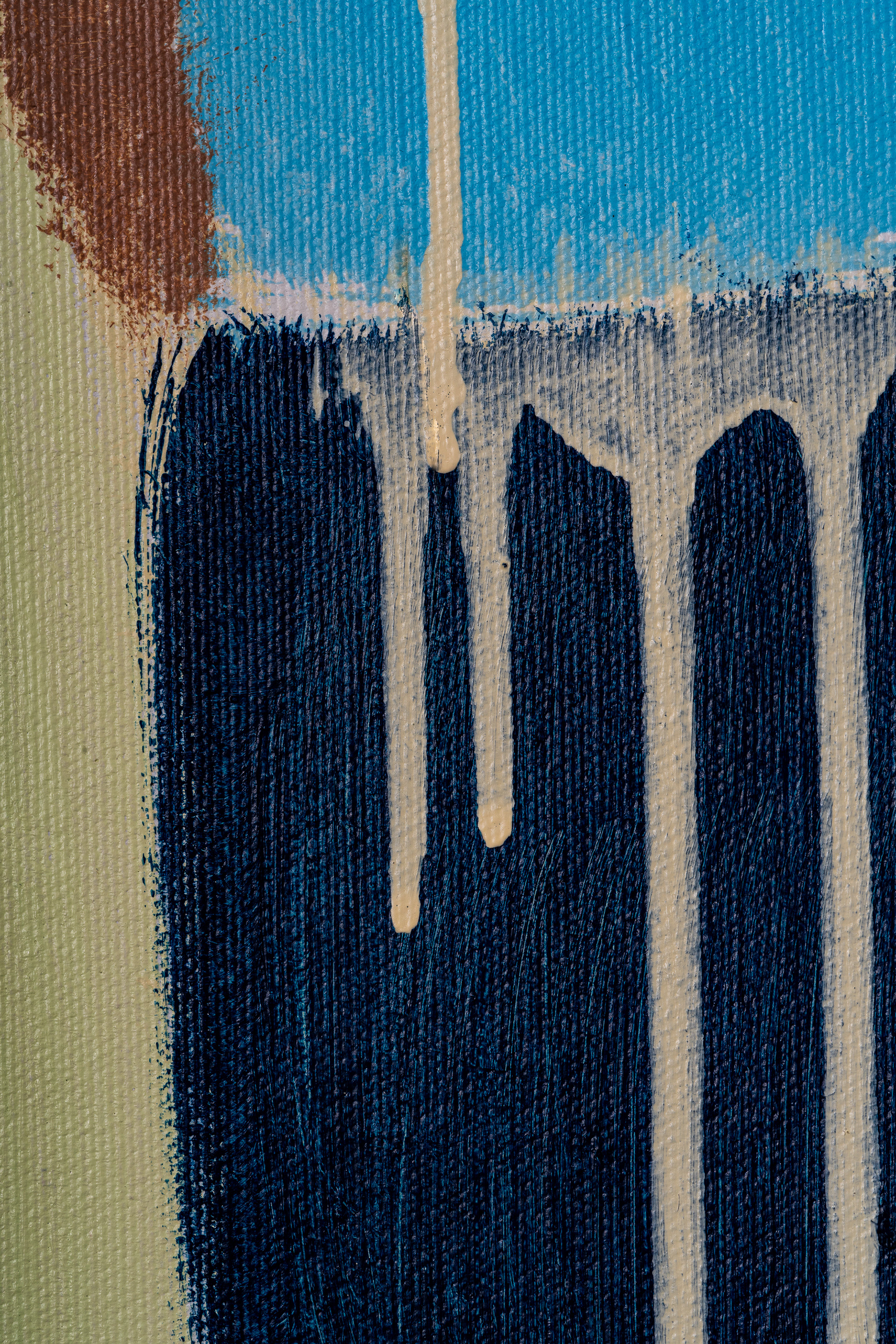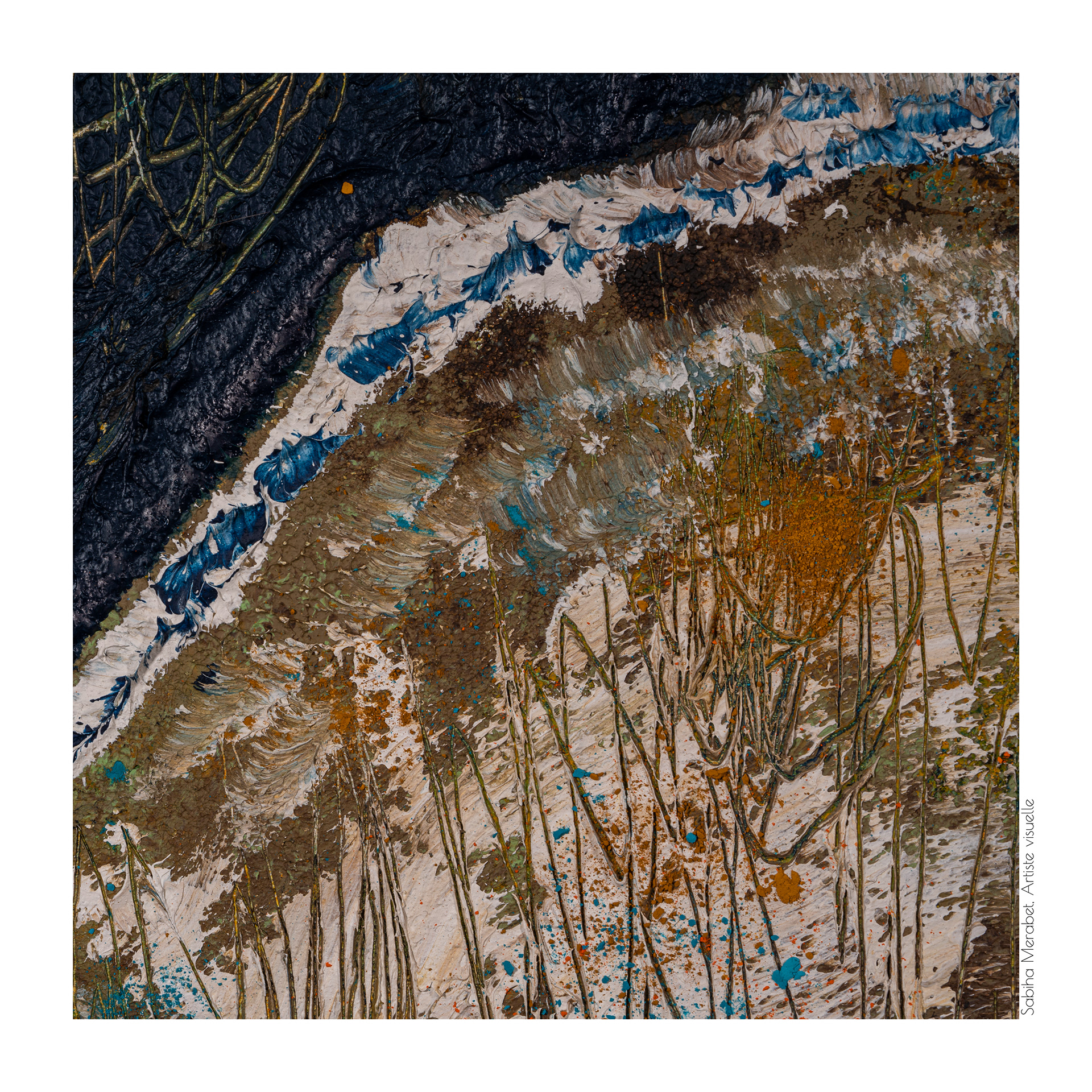Dans cette œuvre, je poursuis mon exploration de la tension entre le débordement et la retenue. Le bleu semble prêt à déborder, mais quelque chose l’en retient. Je cherche ici à capter cet instant fragile où la couleur, bien qu’intense, choisit le silence. C’est dans cette retenue que l’émotion s’imprime. Chaque couche de matière raconte une histoire intériorisée, une présence silencieuse mais profonde.