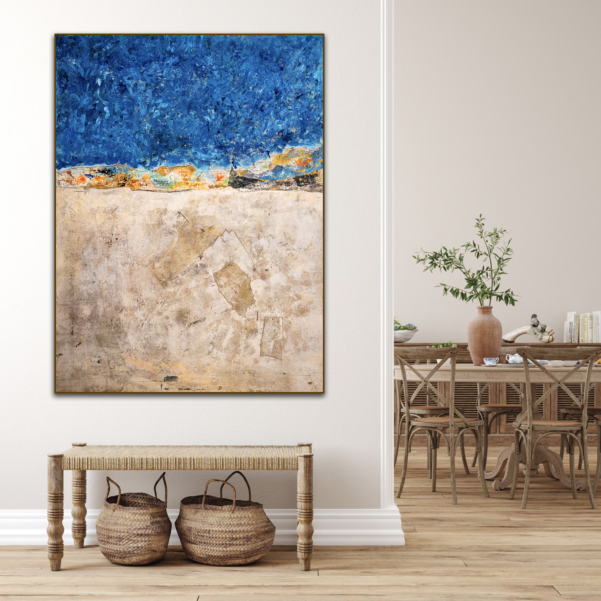 Ces oeuvres engagent ainsi le spectateur dans une contemplation à double sens. Chaque orientation possible est une invitation à découvrir de nouvelles dimensions et interprétations. La toile devient un espace de transformation, où l’horizon, au lieu de limiter, ouvre un passage vers un espace symbolique et spirituel, défiant la gravité et les certitudes.