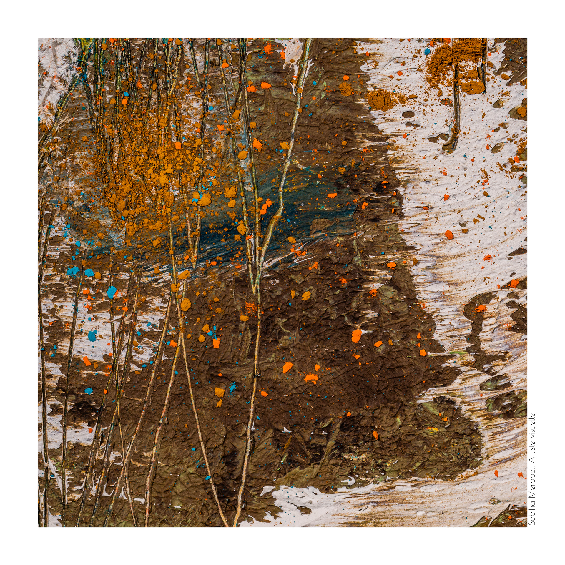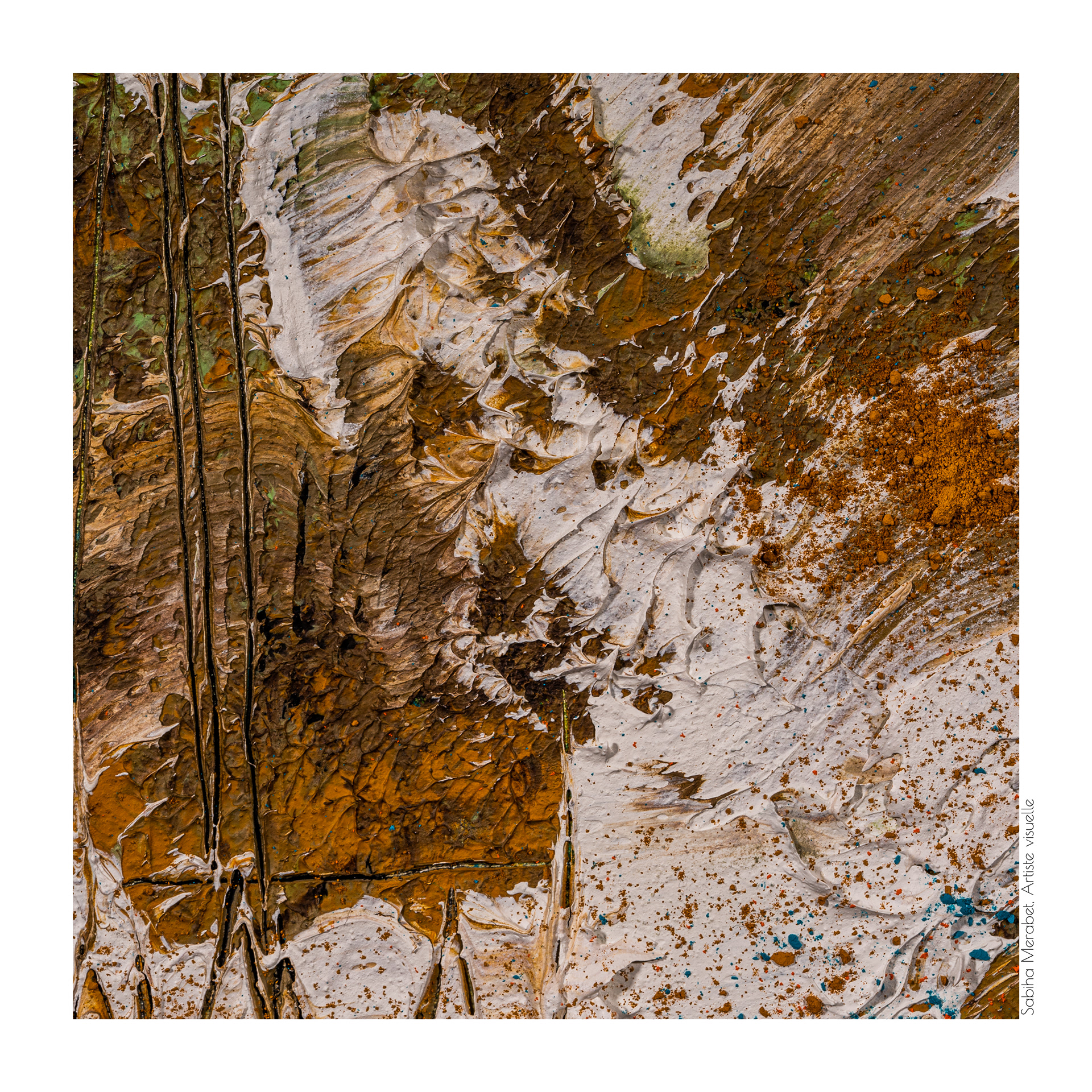 Elle est réalisée sur un cadre panneau en bois (c'est ma première exploration du panneau en bois) avec de la peinture à l'huile, du cold Max Meduim et du pastel en poudre que j'ai gratté pour donner l'illusion de la terre, j'ai ajouté aussi de la poudre de marbre avec de la peinture blanc de titane à l'huile et de la cire froide pour donner du relief. Les détails vous donnent un aperçu de tous les éléments ajoutés. J'ai beaucoup aimé travailler sur le bois ce que j'aime avec le bois, c'est le fait qu'on peut gratter plus en profondeur la surface pour révéler les couleurs qui se cachent sous la surface de la terre. J'espère qu'elle vous plaira.