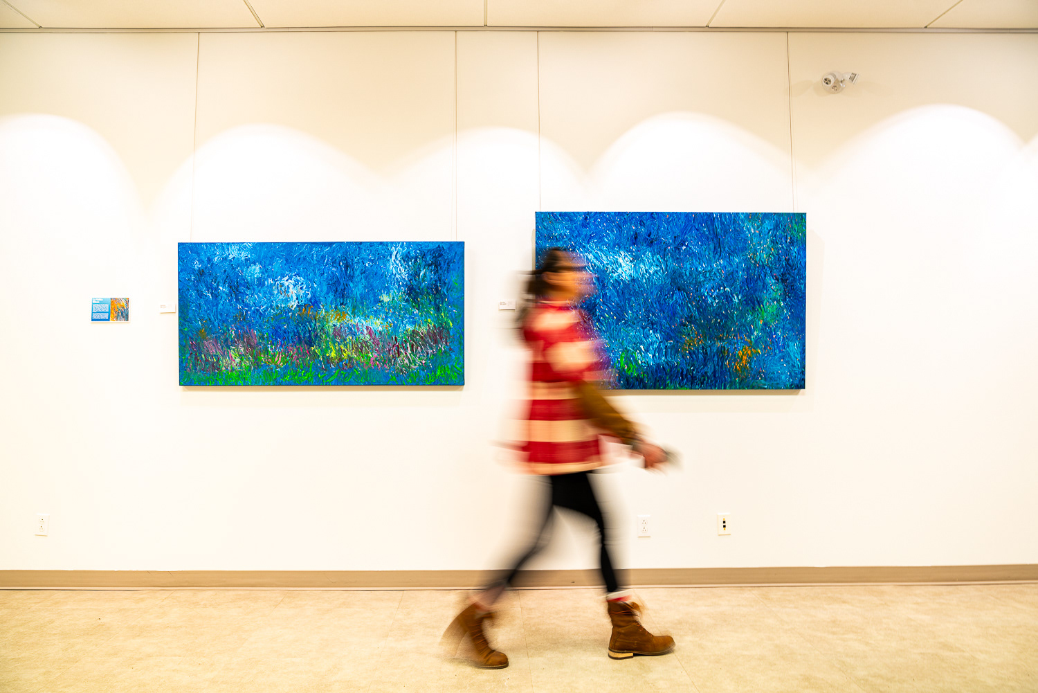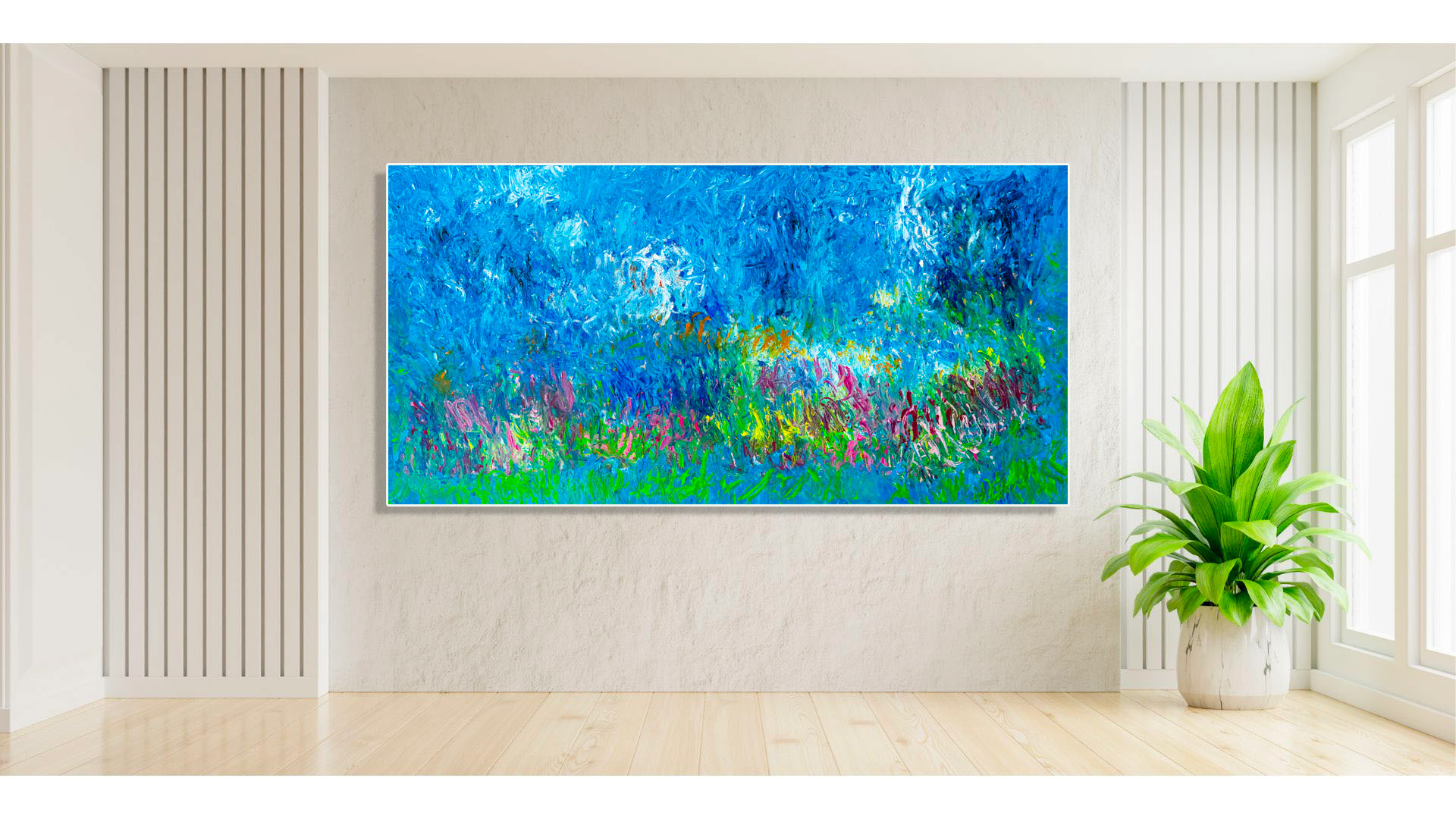 Cette dernière toile intitulée « La Vallée bleue", capture l'émerveillement d'un paysage sans borne définie. Les traits délicats de couleurs à l'huile, ponctués de touches vives, évoquent une profusion de vie dans cette vallée onirique.