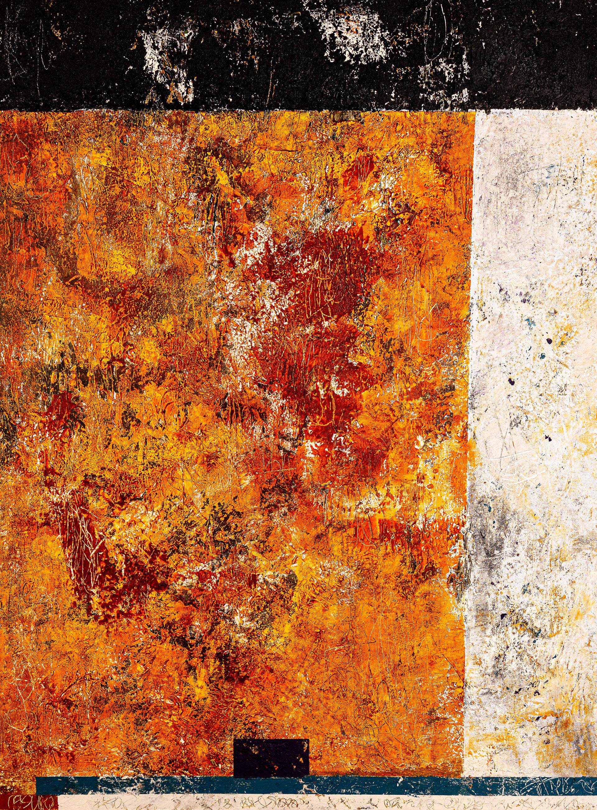 La superposition de la peinture à l'huile, des pigments et de la cire froide sur plusieurs couches vient créer une symphonie de textures et de nuances abstraites. Cette stratification volontaire traduit un processus de sédimentation émotionnelle, où chaque trace, chaque empâtement, devient mémoire du geste.