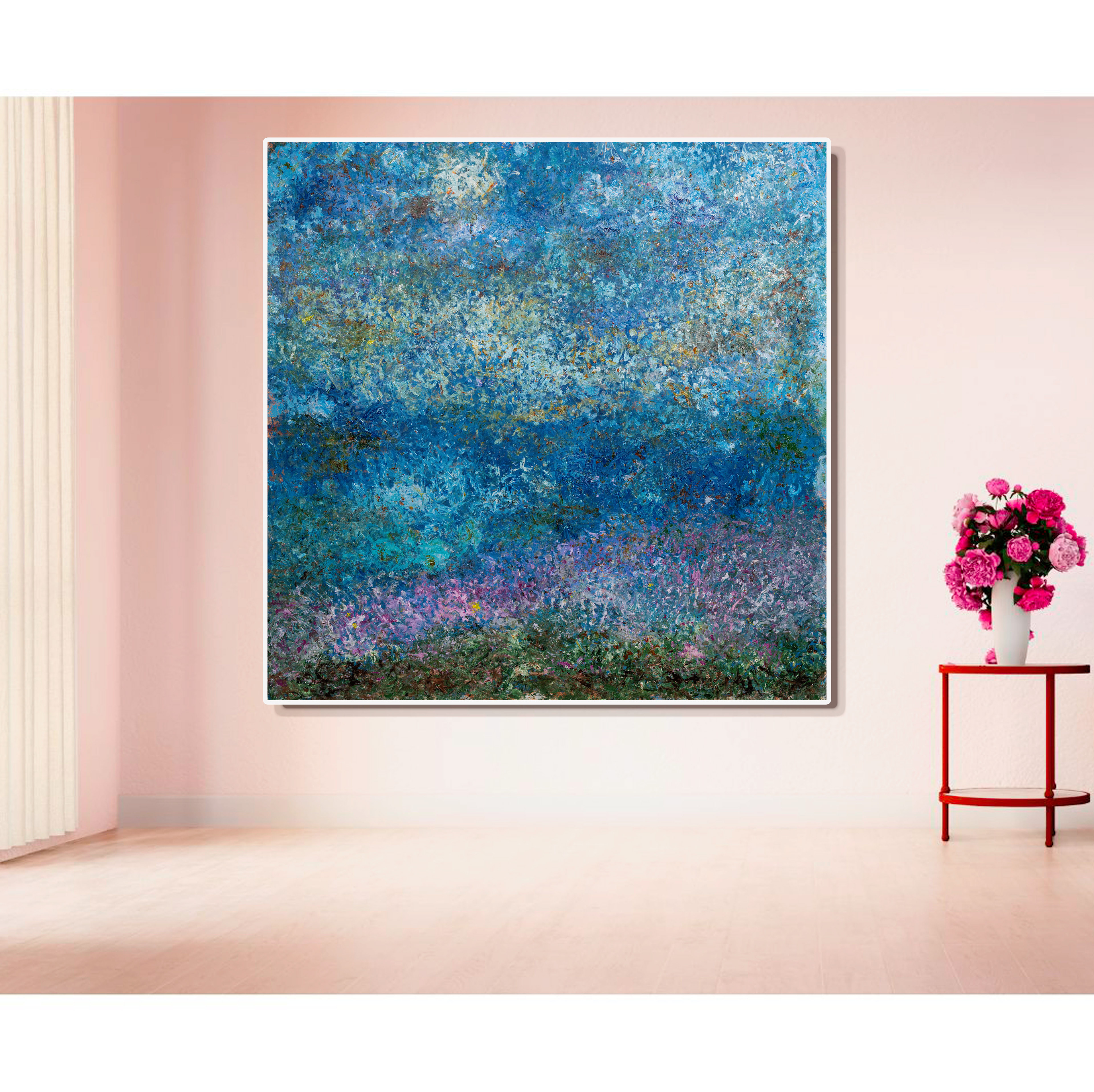 Cette toile, réalisée sur un grand format, évoque l'évasion et la rêverie, les nuances de bleu apaisantes viennent capturer l'essence d'une "Vallée Bleue" ainsi que ses touches fleuries.